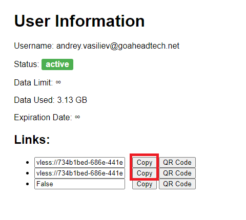 Пройти по этой ссылке (вставляем её в браузере), увидим такую страницу с конфигурацией, нажать на copy напротив "vless:// ...":