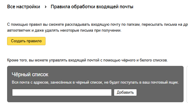 Перехожу в "правила обработки писем":