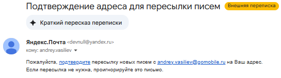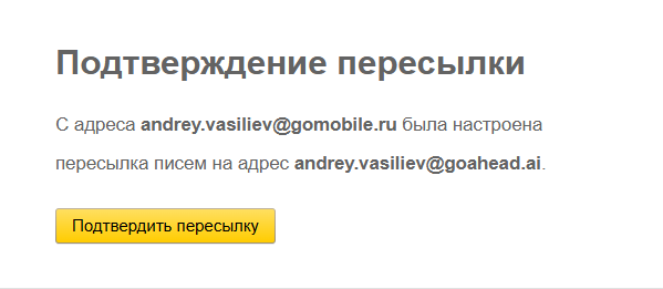 Идём в основную учётку (goahead.ai), находим письмо с темой "Подтверждение адреса для пересылки писем", в нём ссылка на слове "подтвердите" - нажимаю: