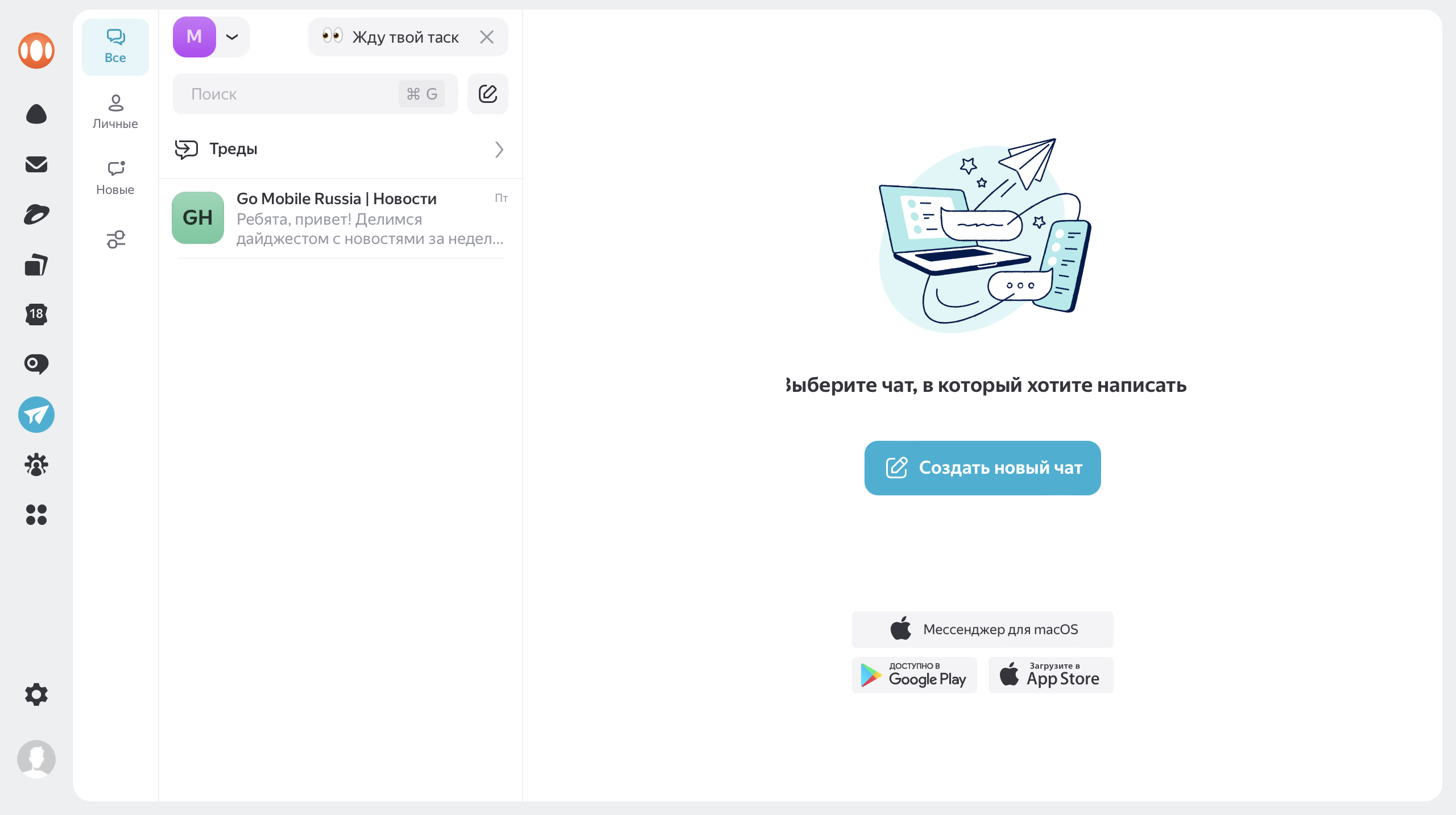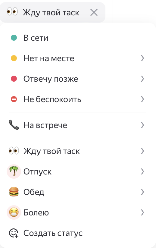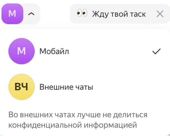 • Поиск. Тут ты можешь искать сообщения по словам и фразам, коллег по именам на латинице и чаты по названиям.