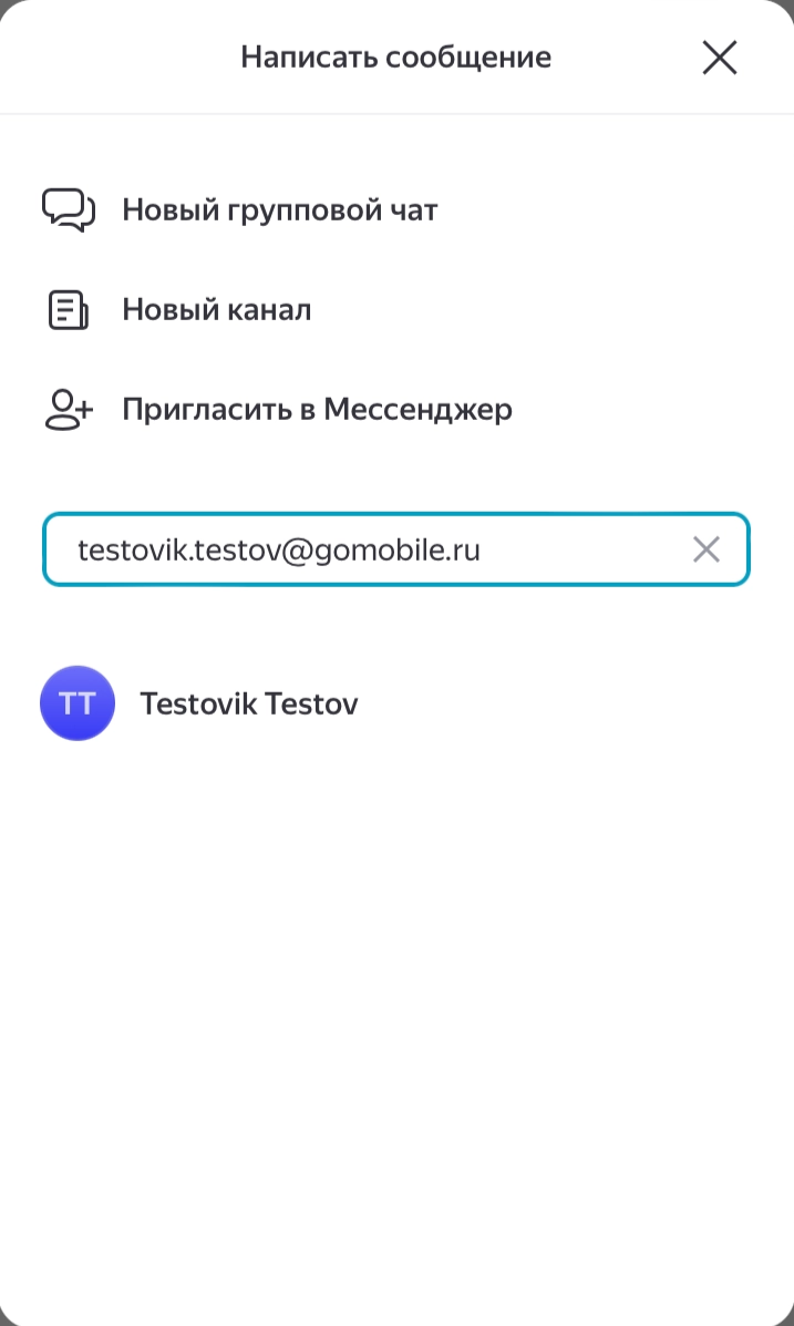 Для создания обычного чата достаточно в панели создания чатов ввести Имя Фамилию человека в транскрипции или его почту в Яндексе, после чего выбрать его. После этого откроется окно чата с данным человеком.
