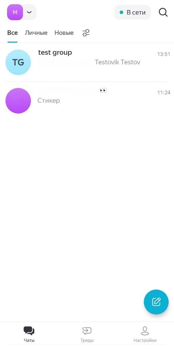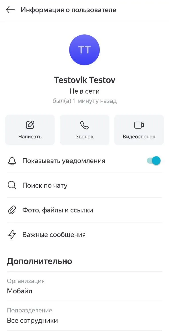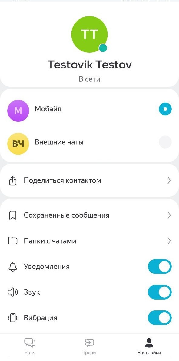 - Переключение между внутренними и внешними чатами, статус, поиск.