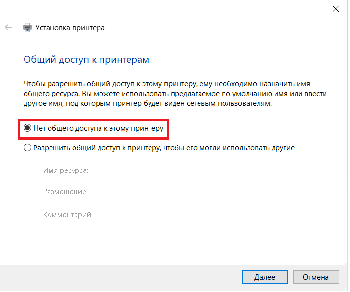 12. На данной странице выбираем "Нет общего доступа к этому принтеру" (всё верно, эта настройка не значит, что вы запретите печатать коллегам), нажимаем "Далее":
