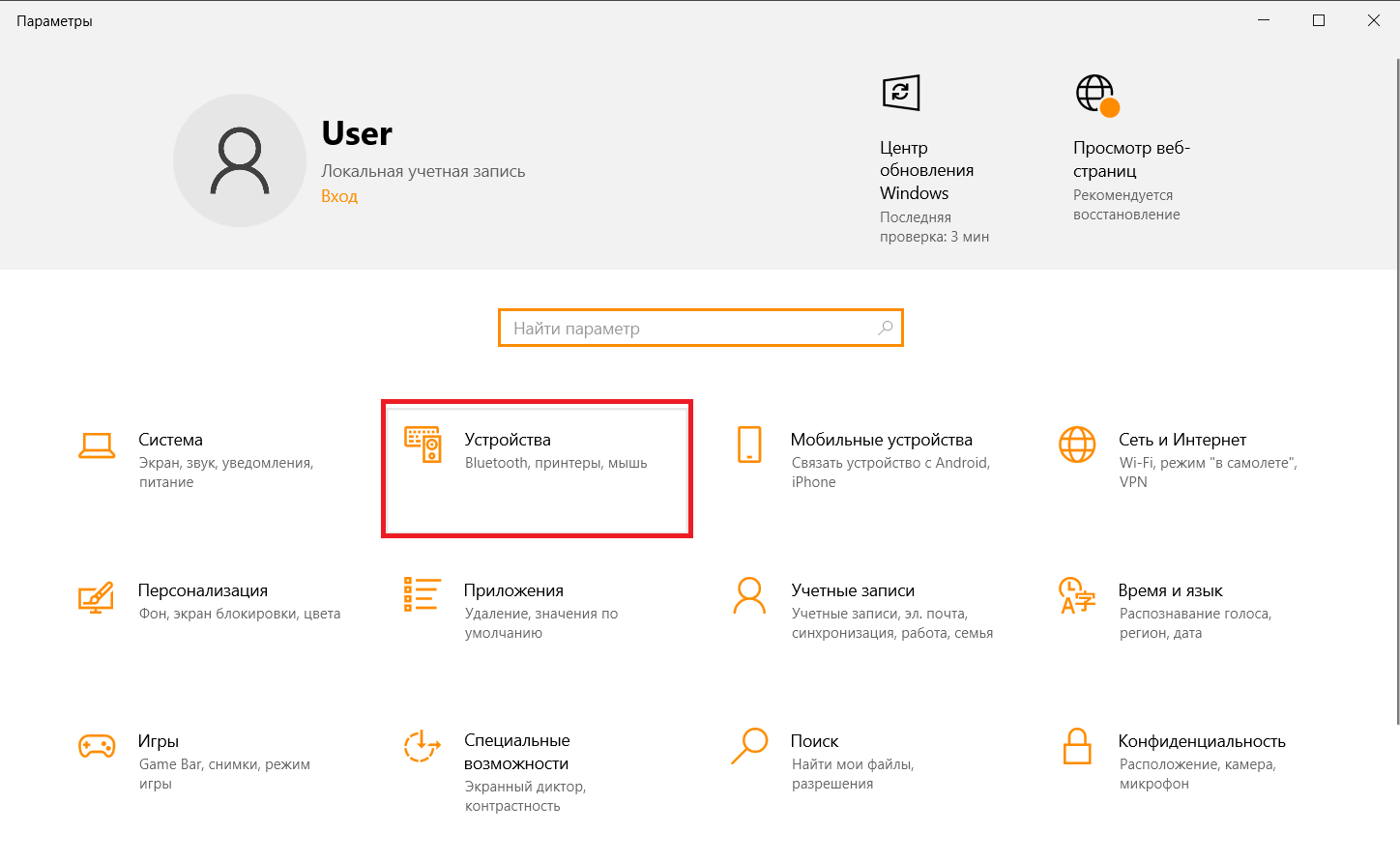 3. В параметрах выбираем "Устройства":