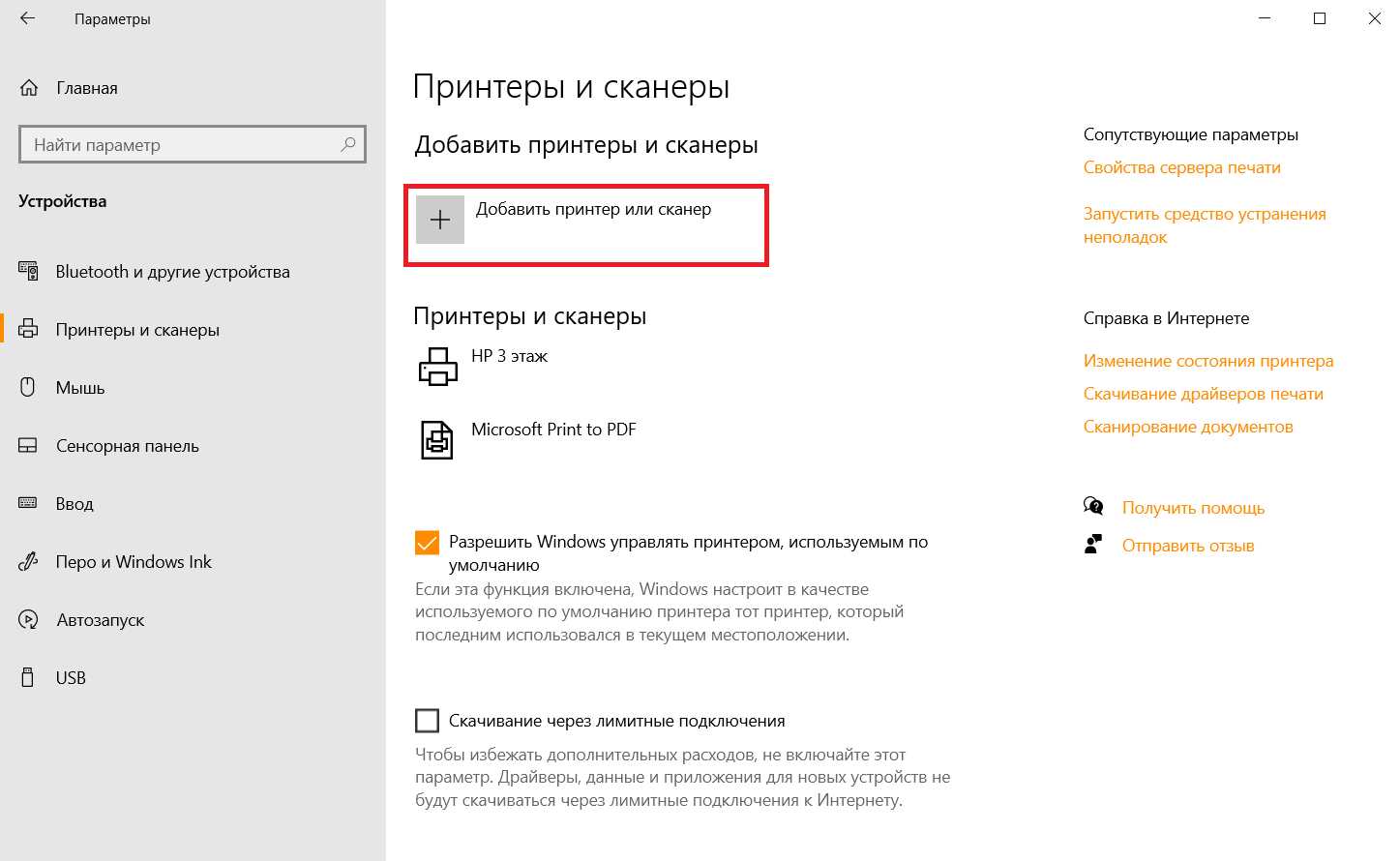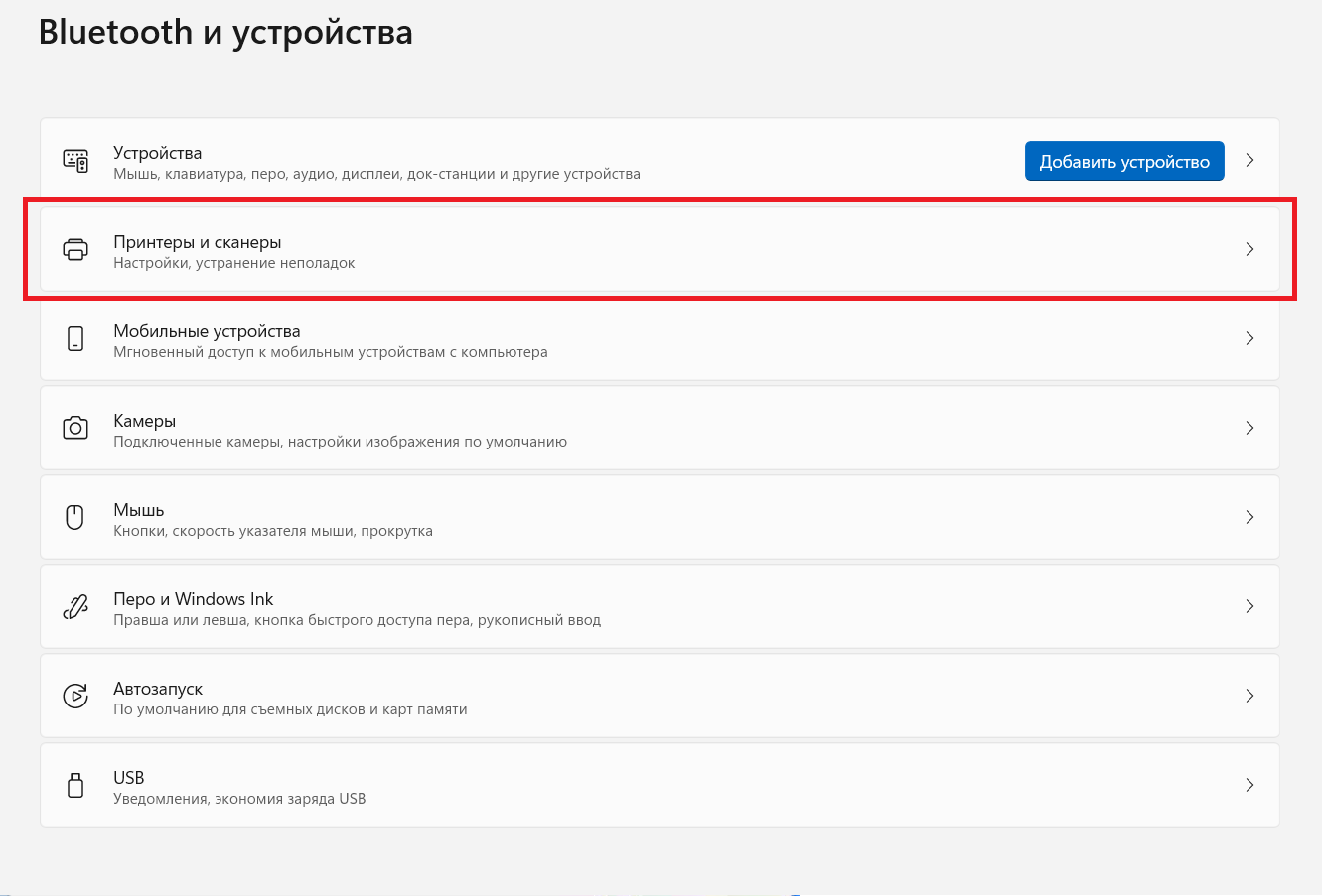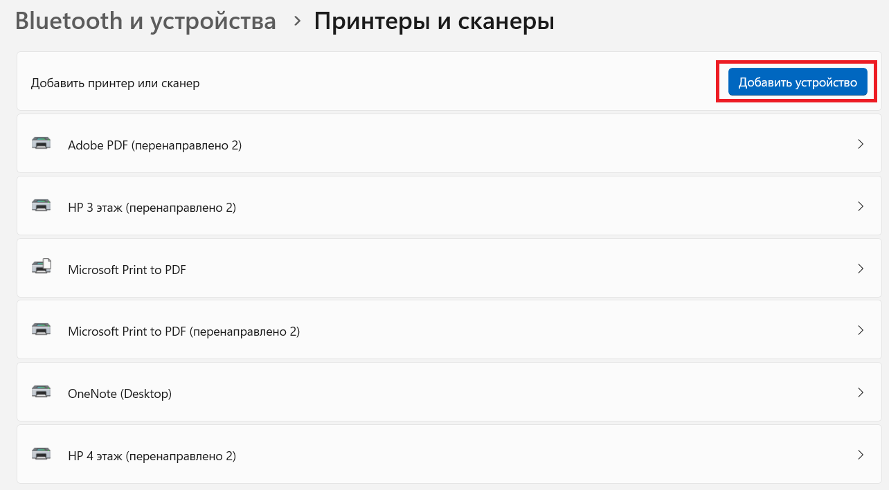 5. Щёлкаем по кнопке "Добавить принтер или сканер":