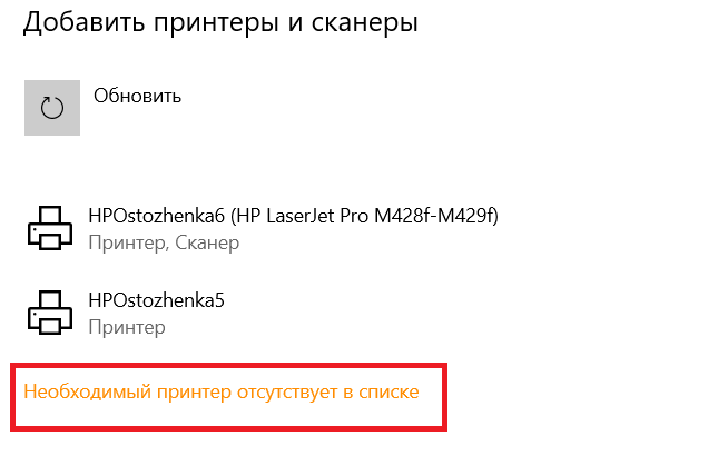 Вместо этого внизу списка кликаем на "Необходимый принтер отсутствует в списке" (опять же, даже если он присутствует!):