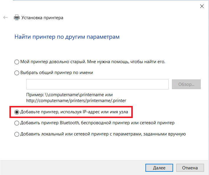 7. В открывшемся меню выбираем "Добавьте принтер, используя IP-адрес или имя узла", нажимаем "Далее":