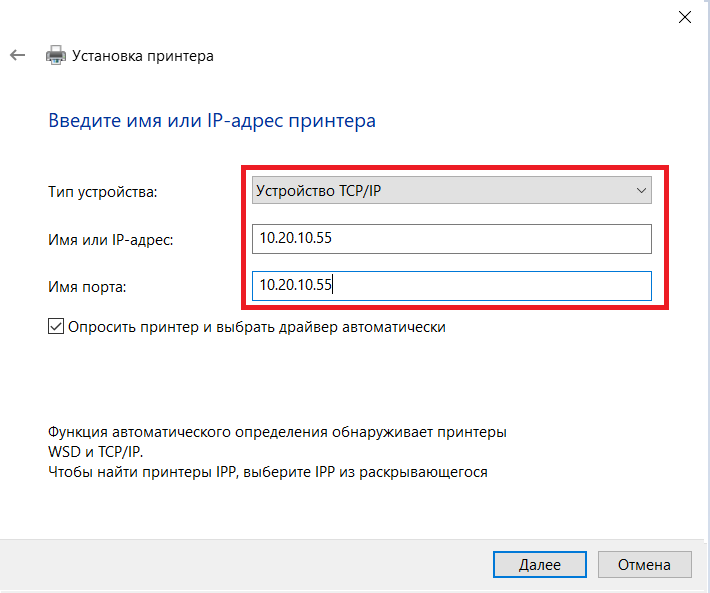 8. Выбираем в типе устройства - "Устройство TCP/IP", в "Имя или IP-адрес" вводим актуальный айпи принтера (его можно посмотреть тут), затем нажимаем "Далее":