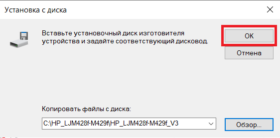 Нас вернуло в окно "Установка с диска" с подставленным путём до драйвера принтера, нажимаем "ОК":